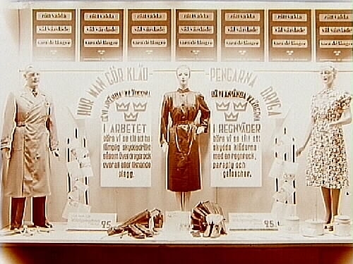 Titel: Skyltfönster med kläder, specialaffär, Konsum.