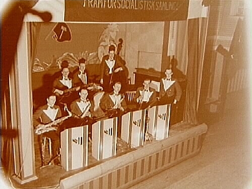 Merry Makers Dansorkester, 8 män med musikinstrument: saxofon, gitarr, trumma, bas, trumpet.