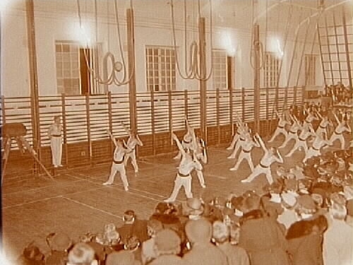 Arbetarnas gymnastikförening (AGF), gruppbild, gymnastikuppvisning.