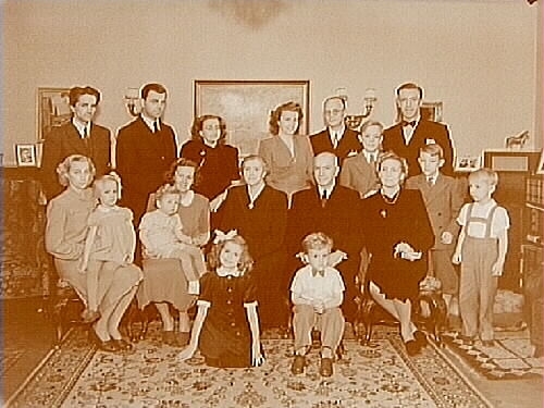 Titel: Rumsinteriör, släktgrupp 11 vuxna och 7 barn. Disp. Malm.