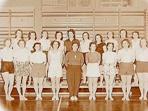 Titel: Husmodersgymnastik, gruppbild. Vasaskolans gymnastiksal.
