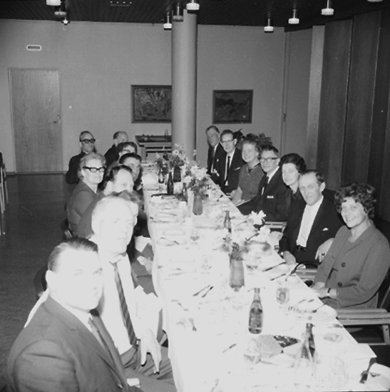 Rumsinteriör, grupp vid bordet. Personalklubben uppvaktar, Majgren avtackas.