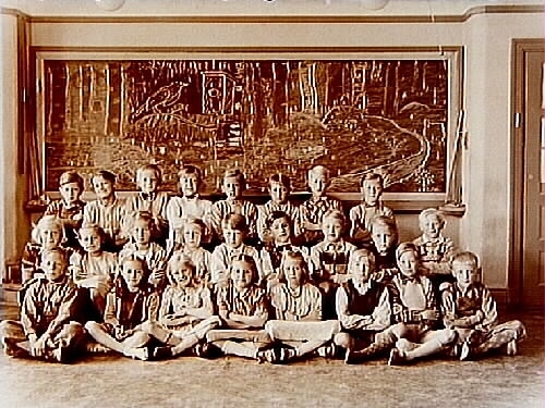Engelbrektsskolan, klassrumsinteriör, 25 skolbarn med lärarinna fru Elsa Edberg, klass 2, sal 3.