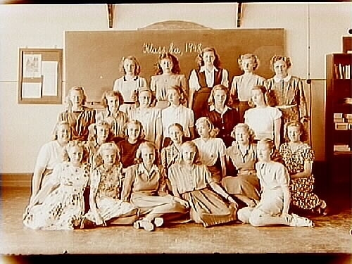 Olaus Petriskolan, klassrumsinteriör, 22 flickor med lärarinna fröken Ruth Widell, klass 8a.