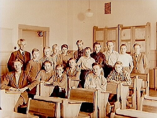 Almby Södra skola, klassrumsinteriör, 16 pojkar med överlärare Albert Johansson, klass 8E, sal 2.