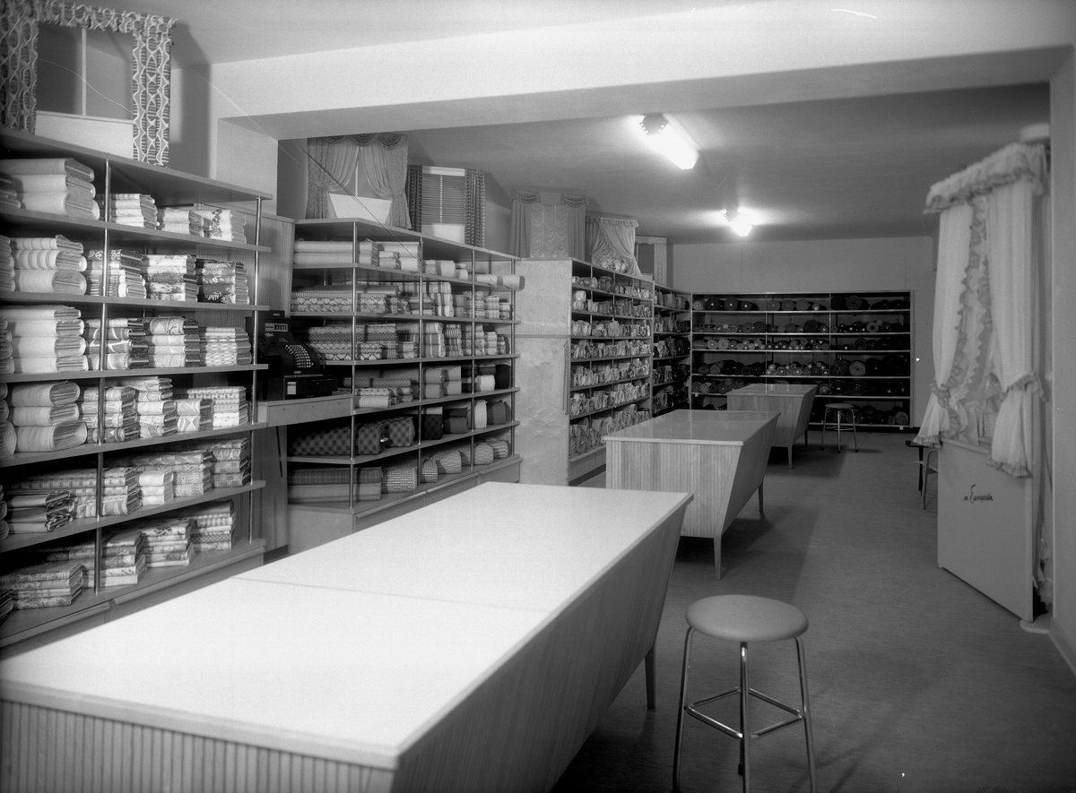 Klaessons Möbelaffär, interiör från gardinavdelningen.