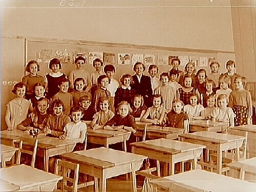 Vasaskolan, klassrumsinteriör, 35 flickor med lärarinna fru Barbro Ahlecrantz, klass 4d, sal 20.