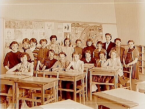 Vasaskolan, klassrumsinteriör, 18 flickor med lärarinna fru Margareta Berg, klass 6c, sal 17.