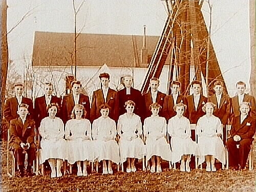 Konfirmander, 7 flickor, 11 pojkar och pastor Hedlund.