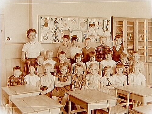 Klassrumsinteriör, elever med lärarinna fru Elna Karlsson, sal 1 AS.