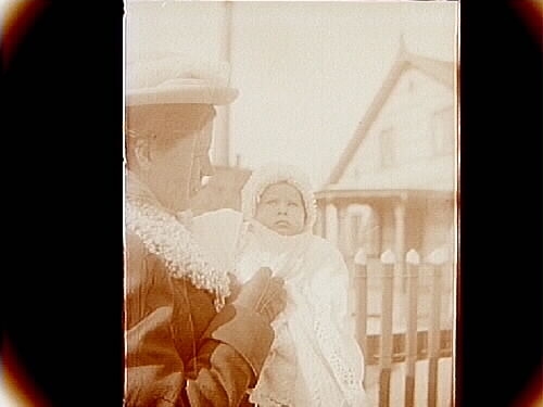 8/4 1909. Dam med baby utanför ett hus