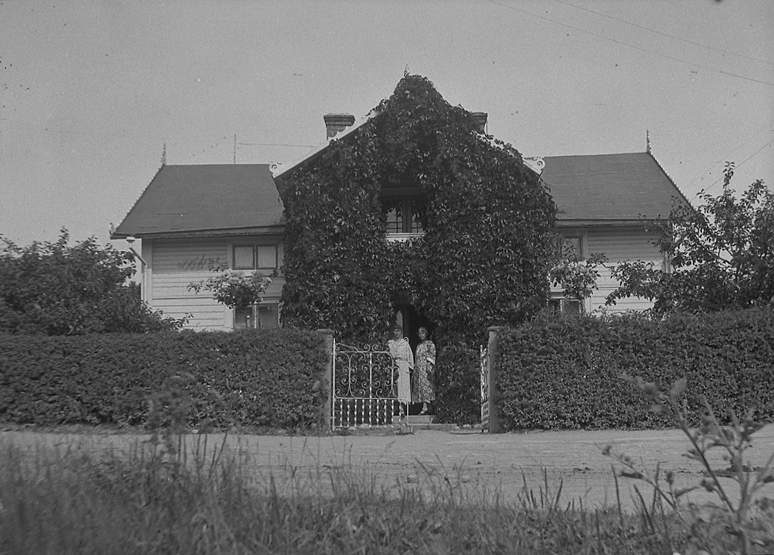 Bostadshus, två kvinnor framför huset.