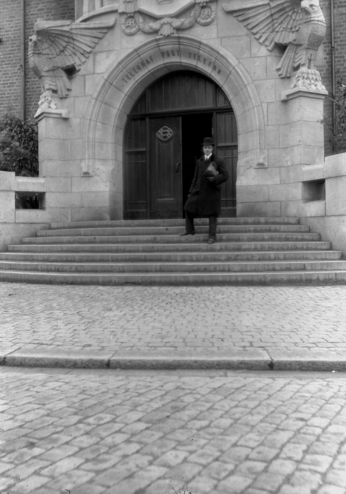 Telegrafhuset (Telegraf, Post, Telefon), en man på trappan.