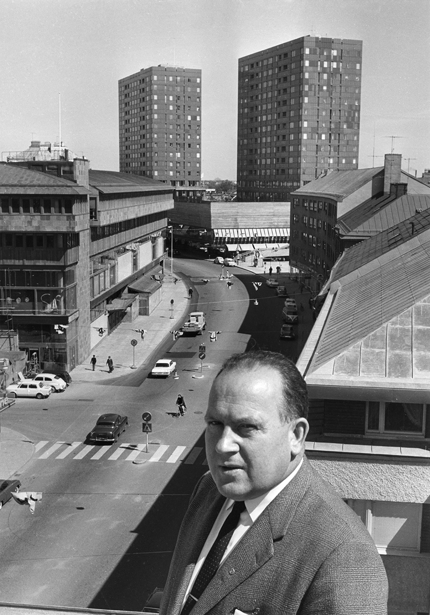 Porträtt Harald Aronsson med varuhuset krämaren i bakgrunden.