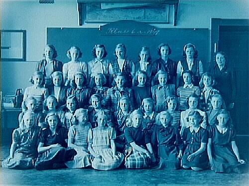 Olaus Petriskolan, klassrumsinteriör, 33 flickor med lärarinna fru Elsa Olsson, klass 6a, sal 11.