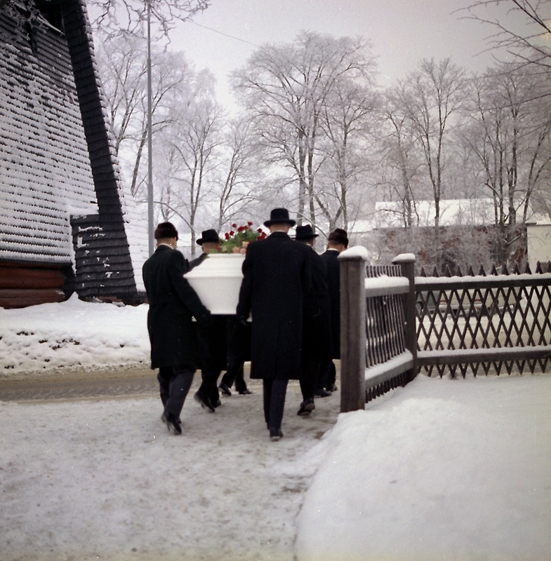 Begravning i Ljusnarsbergs kyrka, män som bär likkistan ut från kyrkan.