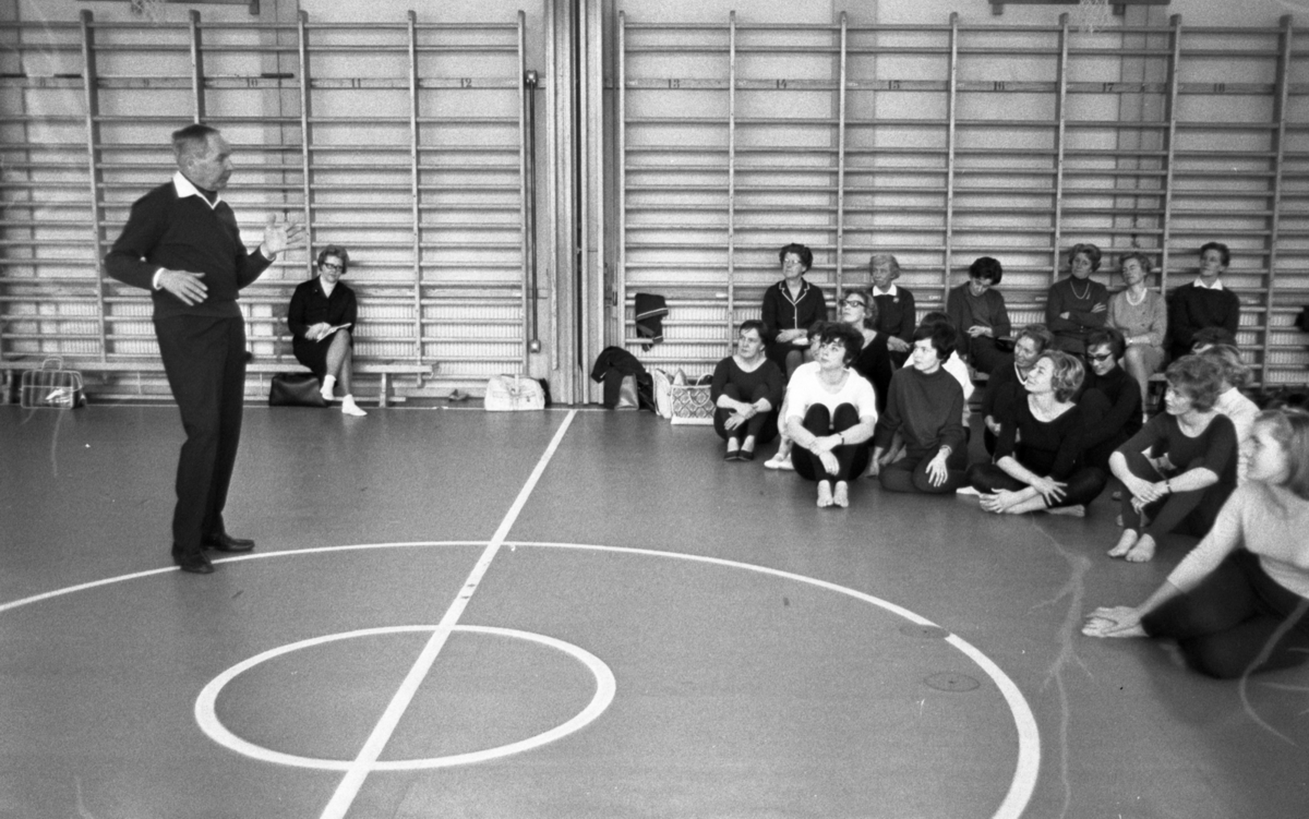 Till vänster på bilden syns idrottsledare Ernst Idla instruera åhörare. Han är klädd i mörk tröja med vit krage och mörka byxor. I halsen har han en scarf. Bakom honom på en långbänk vid väggen sitter en kvinna och lyssnar. Till höger på bilden sitter några gymnaster på golvet och lyssnar till Idla. Bakom dem sitter en grupp åhörare på en långbänk. På väggarna hänger ribbstolar. Väskor står på golvet och några tröjor hänger på ribbstolarna. Spellinjer finns utritade på golvet.