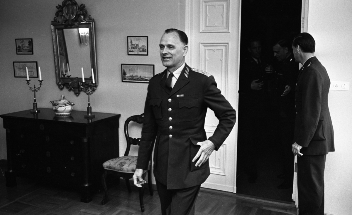 Militären i centrum av bilden är generalmajor Stig Löfgren, militärbefälhavare för Bergslagens militärområde åren 1967-1973.