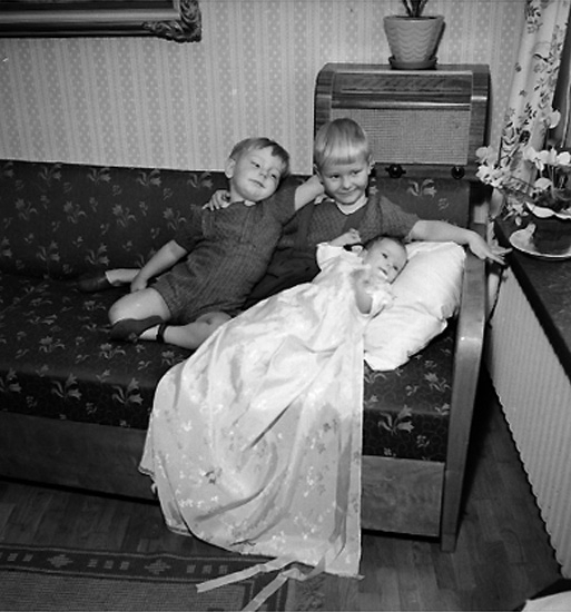Titel: Rumsinteriör, tre barn, barndop. Fru Nils Nilsson