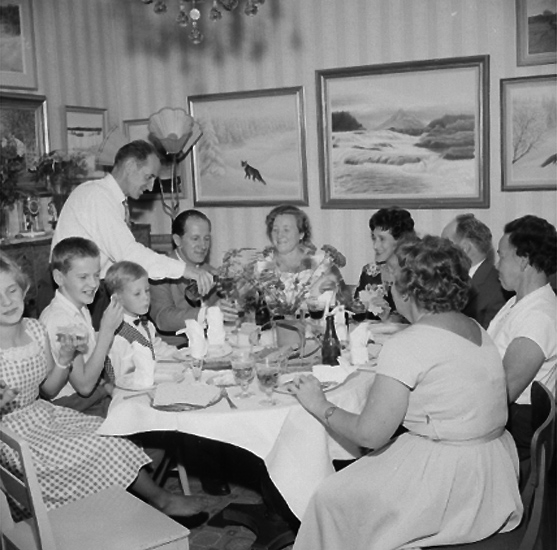 Titel: Rumsinteriör, släktgrupp, födelsedagsfirande. Harry Rex på 50-årsdagen.