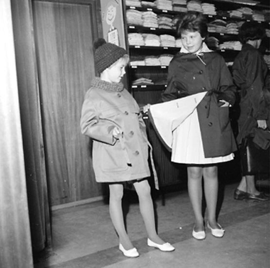 Konsum Damkonfektion, affärsinteriör, två flickor.