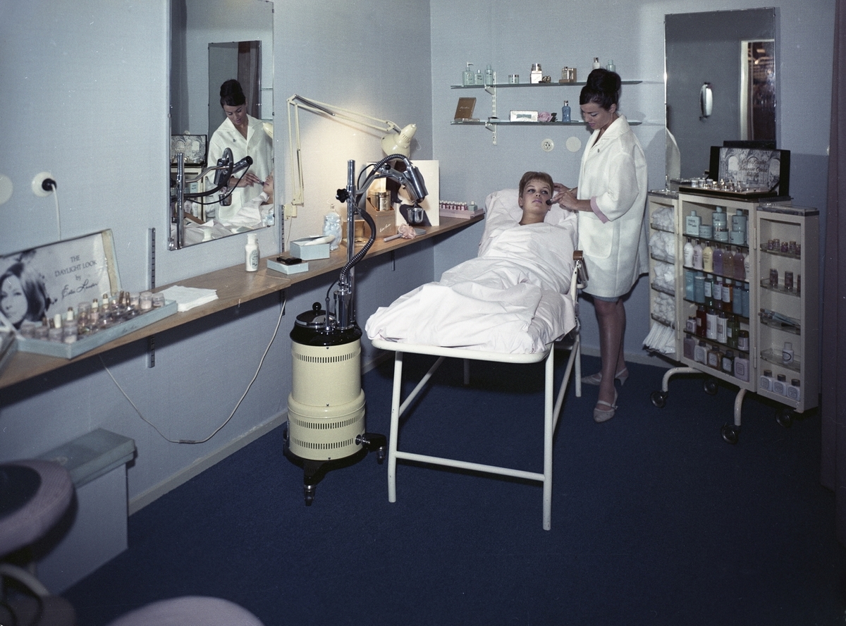 Krämarens skönhetssalong, interiör, två kvinnor.