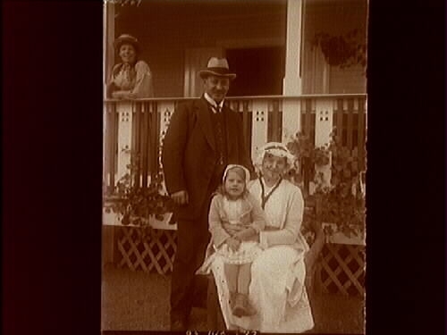 På verandan Gerda Thermaenius, i förgrunden systern och svågern med barn.