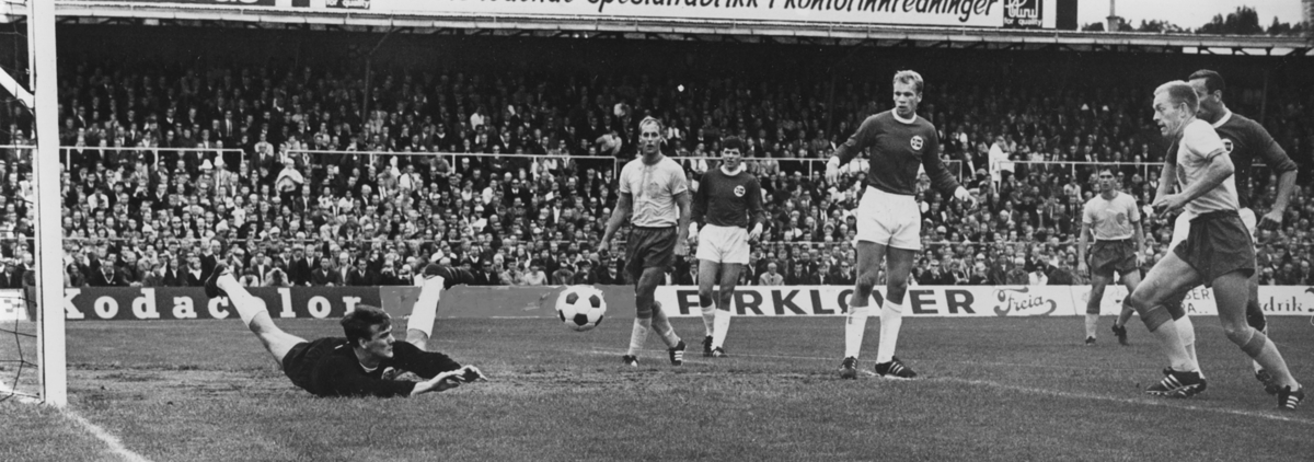 Fotbollsmatch. Leif Eriksson gör sig beredd att slå in 1-0 på Ulleväl, Norge, den 15 september 1968.