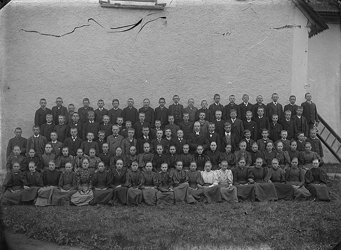 Titel: Konfirmation, konfirmander och en präst. Kyrkobyggnad.