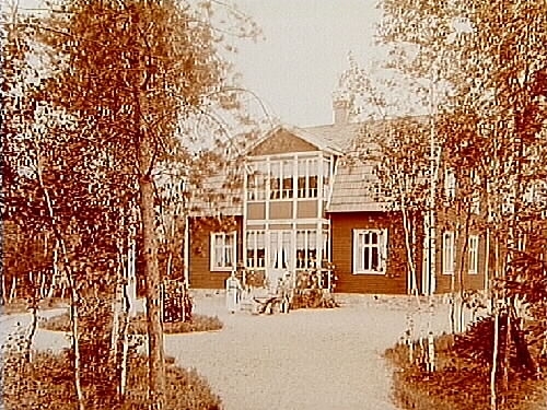 Titel: Haga, Adolfsberg, Örebro. En och en halvvånings bostadshus med brutet tak, glasad balkong och veranda. 4 personer vid trappan framför huset. Karl Ullriksson