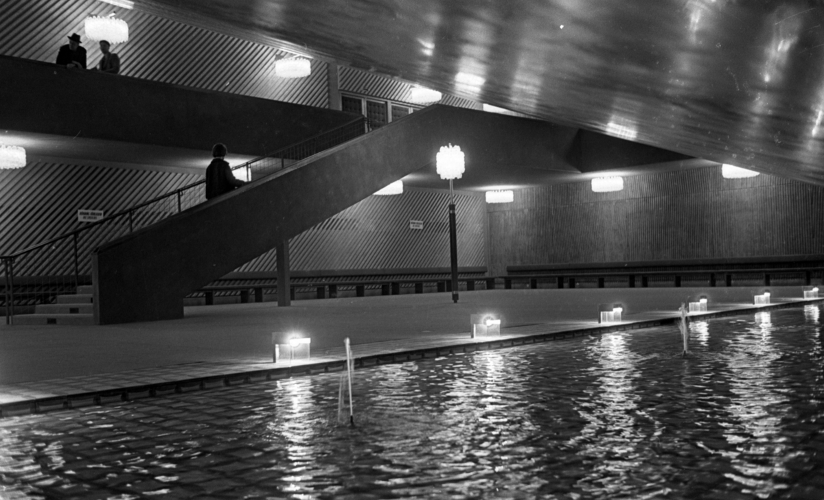 Vattenbassäng med belysning i förgrunden. Kvinna på väg uppför trappa i bakgrunden. Två män stående i bakgrunden en trappa upp.