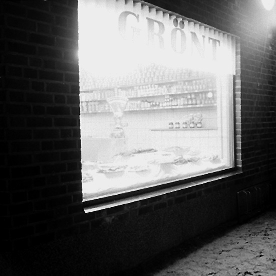 Konsum, affärsbyggnad, skyltfönster med grönsaker.