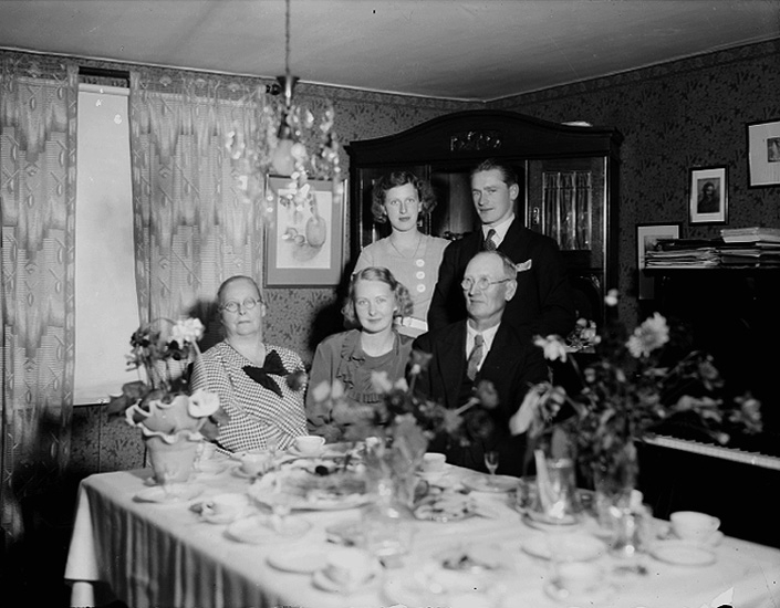 Rumsinteriör, familjegrupp 5 personer, högtid.