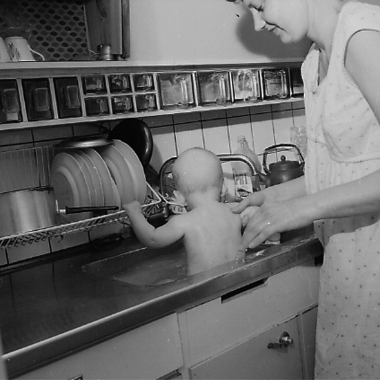 Rumsinteriör, en liten pojke som badar i diskhon, en kvinna.