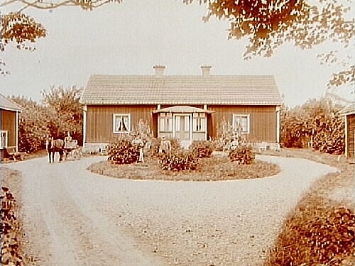 Envånings bostadshus med glasad veranda, två st. flygelbyggnader. 3 personer framför huset.