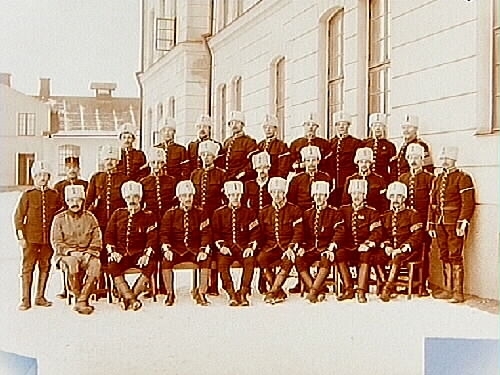 Soldatgrupp i pälsmössor, 27 soldater utanför kompaniet.