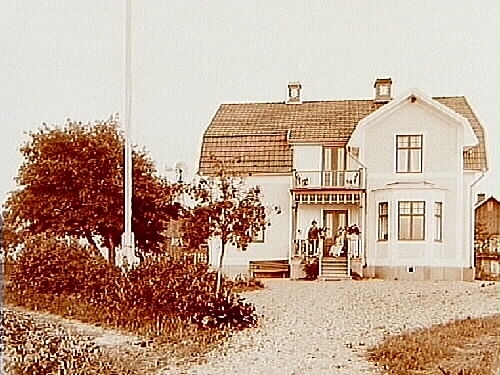 Vinkelbyggt en och en halvplans bostadshus med burspråk, balkong och förstubro.