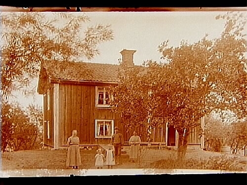 Tvåvånings bostadshus, tre vuxna och två barn framför huset.