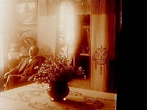 Titel: Rumsinteriör, 2 personer. Fru Anna Lennström Stereoskopsplåt. Två bilder (8x8 cm) på samma plåt (8x17 cm).