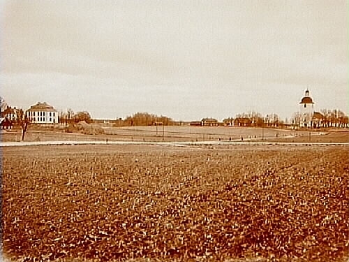 Stora Mellösa kyrka, kyrkobyggnad och sex bostadshus till vänster.
