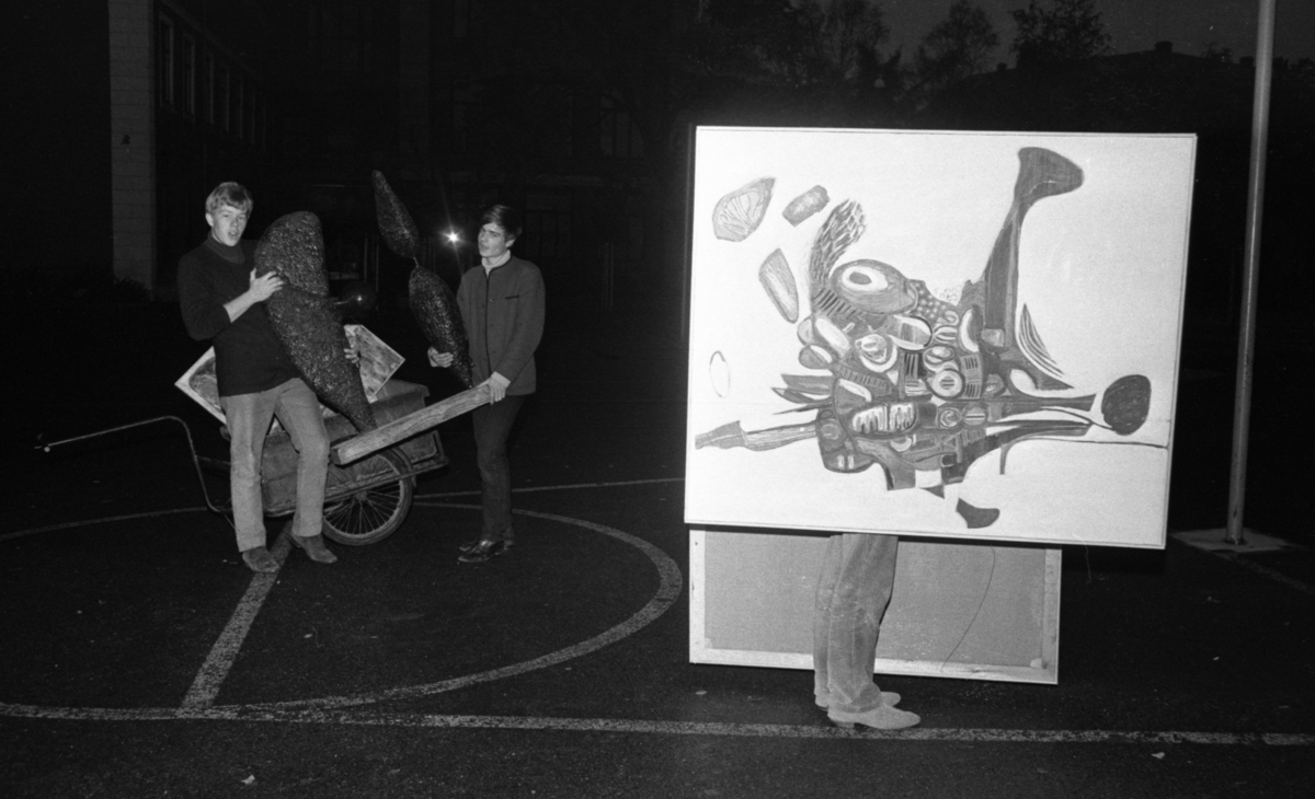 Två unga män till vänster kommer bärande på en skulptur. Den unge mannen till vänster är klädd i en mörk, långärmad tröja med en ljus tröja inunder, ljusa byxor och ljusa skor. Den unge mannen till höger är klädd i en ljus jacka med vit tröja inunder, mörka byxor och mörka skor. Bakom dem står en tranportkärra. Till höger står en ung man delvis dold bakom en stor tavla. Bara en bit av hans ljusa byxor och skor syns nedtill. Bakom honom skymtar en tavla till.