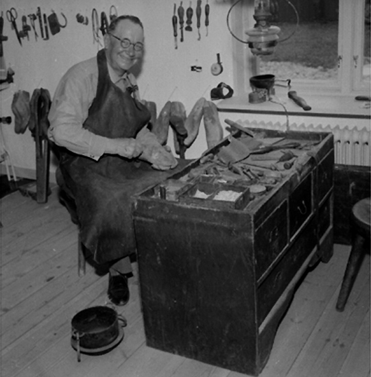 Skomakare i Wadköping, interiör, skotillverkning, en man.