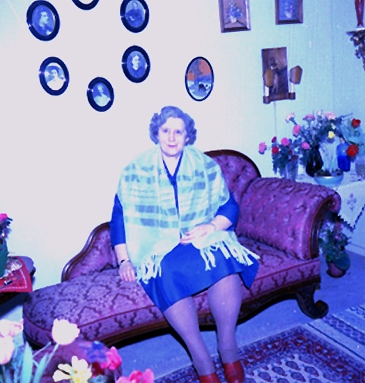 Titel: Rumsinteriör, en kvinna. Fru Greta Bergman på födelsedagen.
