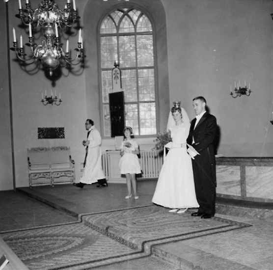 Interiör av Stora Mellösa kyrka, brudpar, en präst och en flicka.