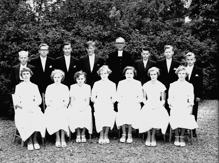 Konfirmander, sju flickor, sju pojkar och kyrkoherde Gunnar Johansson.