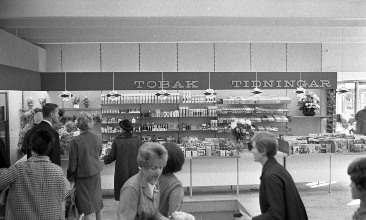 Kunderna utanför kassorna i det nya snabbköpet i Varberga kan handla från disken med tidningar, tobak och skönhetsmedel. Överst långa rader av hårsprayburkar.