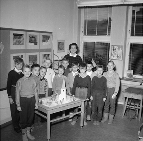 Titel: Hagaskolan, klassrumsinteriör, skolbarn med lärarinna.