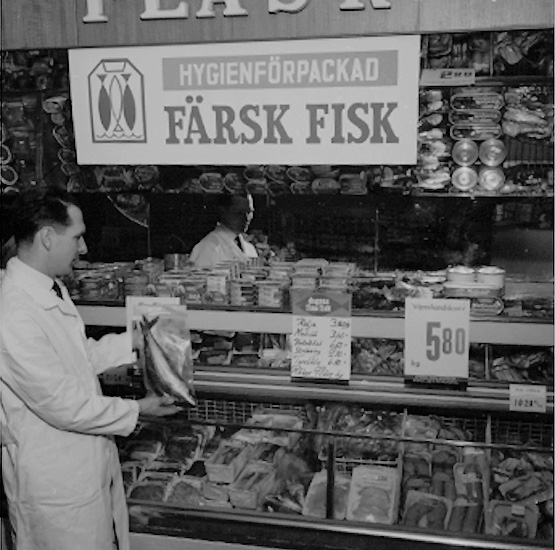 Konsum, affärsinteriör, fiskavdelningen, en man.