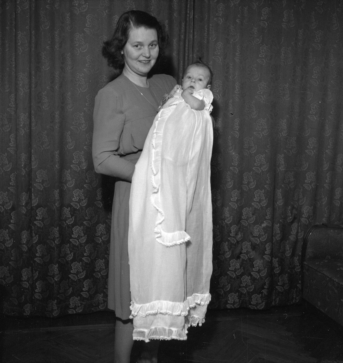 Rumsinteriör, en kvinna och ett litet barn. Barndop.