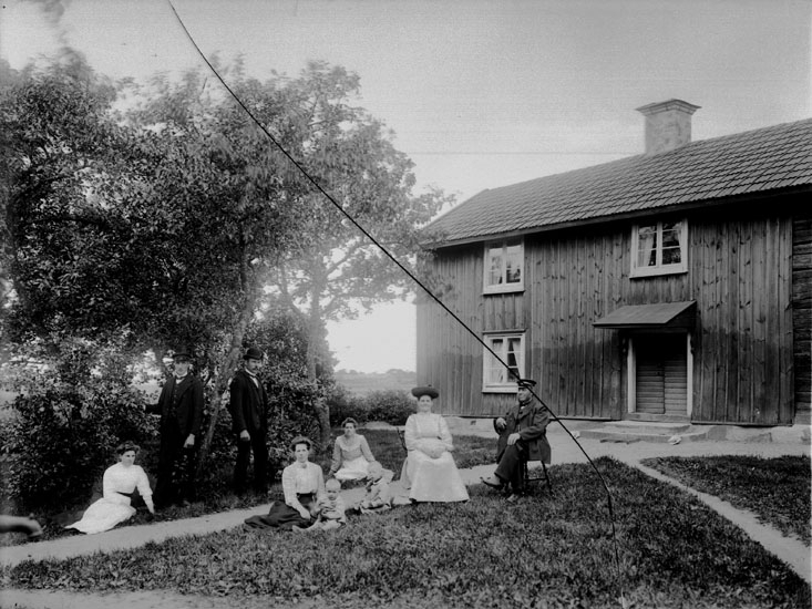 Tvåvånings parstuga, släktgrupp 9 personer framför stugan.